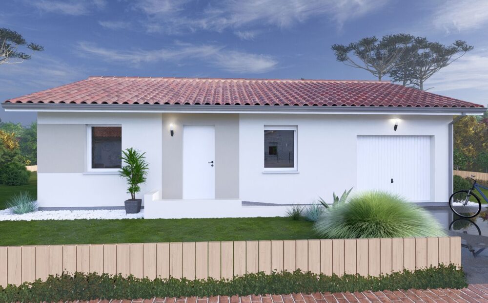 Construction sur vide sanitaire, élévation des murs en brique, couverture en tuiles terre cuite. (Terrain + maison – garantie d’achèvement et de livraison à prix et délais convenus incluse – DO incluse – Frais de notaire inclus – Hors adaptation au sol et raccordements – visuel non contractuel – non mandaté pour réaliser la vente du terrain vu avec nos partenaires).